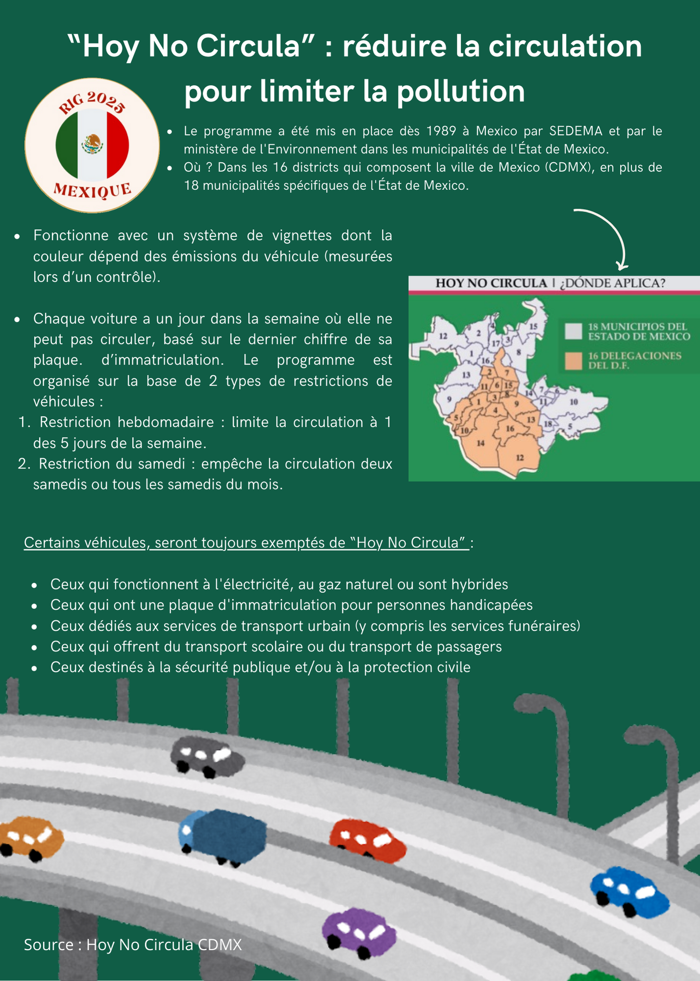 Face à l’urgence climatique, Mexico a mis en place des mesures pour réduire l’impact de la pollution sur la santé et l’environnement de ses habitants. Le système évoqué par Isabella Ramirez est intitulé “Hoy No Circula”. Il a été adopté dans la ville et dans certaines régions du Mexique pour limiter la circulation des véhicules polluants. Selon l’INRIX - entreprise spécialisée dans l'analyse des données de trafic et de mobilité - Mexico fait partie du top 5 des villes les plus embouteillées au monde en 2024. Plus de cinq millions de véhicules y circulent chaque jour.