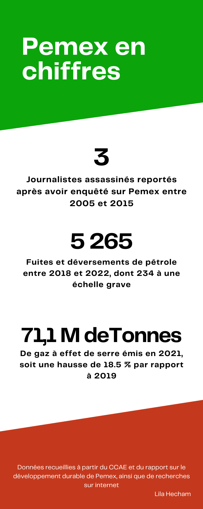 Petróleos Mexicanos (Pemex), l’entreprise nationale d’exploitation du pétrole mexicain est responsable de multiples pollutions environnementales au Mexique : marées noires, contaminations des sols, incendies, fuites et déversements divers, émissions de gaz à effet de serre… Pemex est dénoncée par les associations environnementales. Elle est pointée du doigt par les médias pour l’ampleur des dégâts environnementaux qu'elle produit mais aussi pour son manque de transparence et sa répression contre les journalistes.